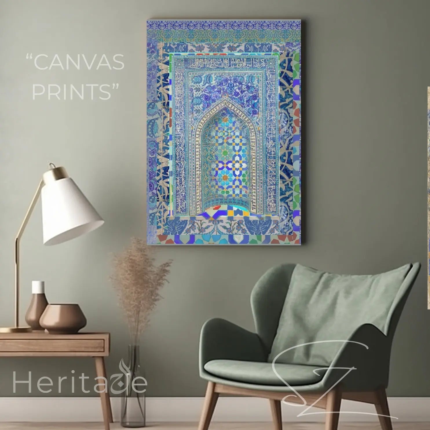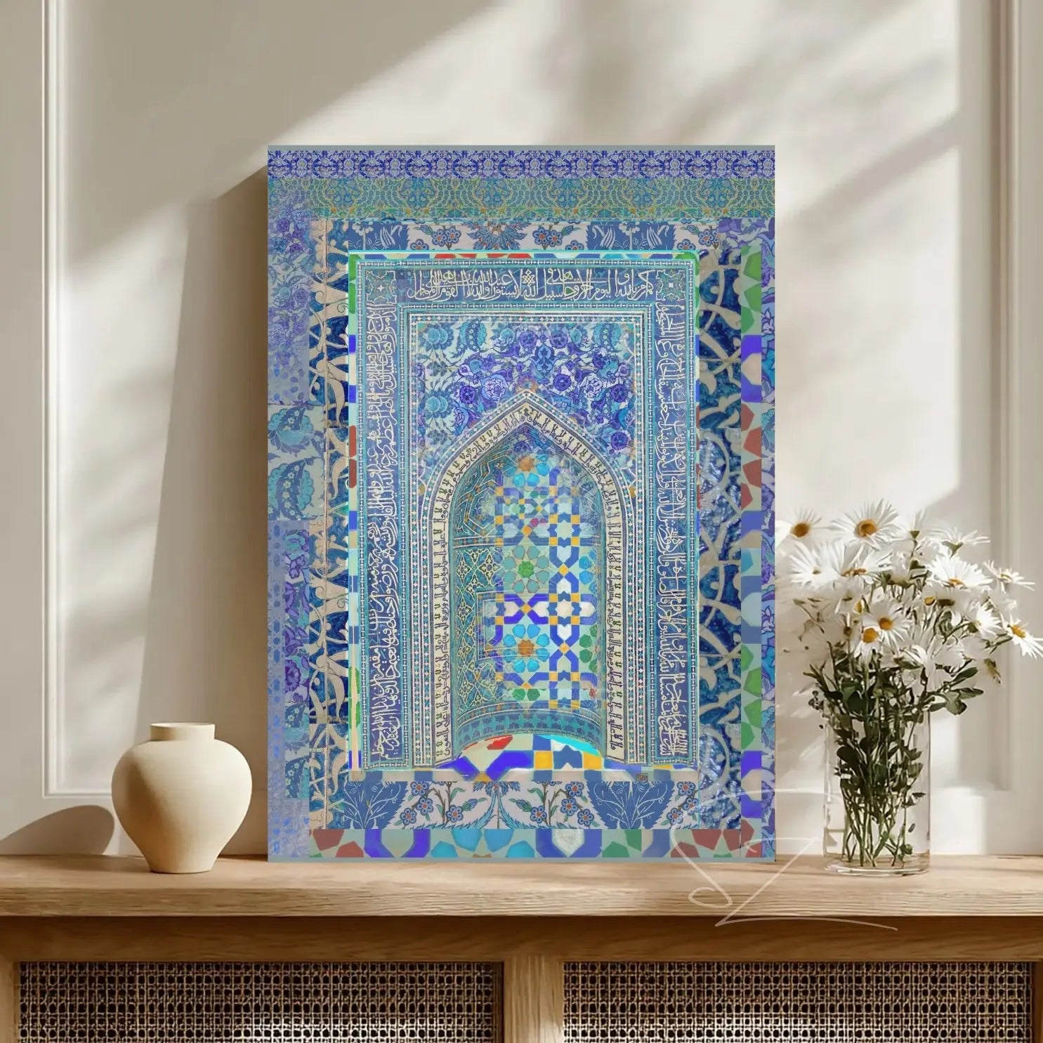 This isn't just a print; it is a structural masterpiece for your home. The 1.25" stretched profile provides a substantial, gallery-wrapped presence that gives the mosaic arch a realistic, three-dimensional feel. Whether you are anchoring a tranquil prayer room, adding a sophisticated focal point to an entryway, or curating a "luxury lifestyle" gallery wall, the deep cobalts and crisp white accents offer a timeless aesthetic that commands attention.
