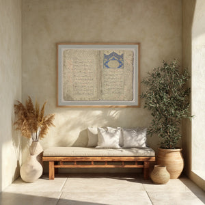 This historic manuscript artwork brings the elegance of 15th-century Islamic book arts into contemporary interiors.