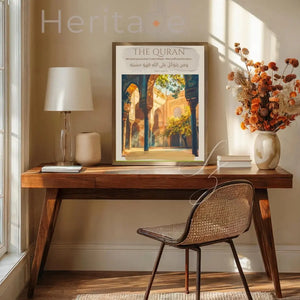 Bring the peaceful beauty of a sunlit courtyard into your home with this elegant Islamic-inspired wall art. The design features a graceful architectural archway framing a tranquil fountain bathed in soft golden light. Neutral sand-toned borders and subtle Arabic script details create a timeless aesthetic that blends spiritual calm with refined decor.