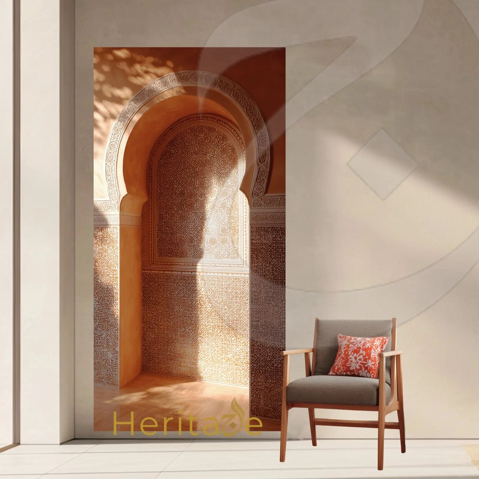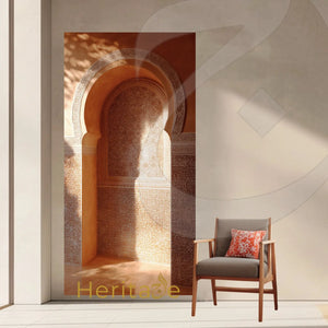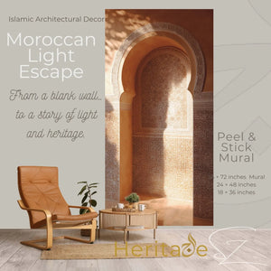 This 36 × 72 inch Stick & Peel Mural captures the warmth of a Moroccan riad interior, centered around a beautifully carved arch niche layered with intricate arabesque patterns and delicate tilework. Rich terracotta tones and golden sunlight create a striking interplay of shadow and illumination, bringing depth, warmth, and a sense of stillness into your space.