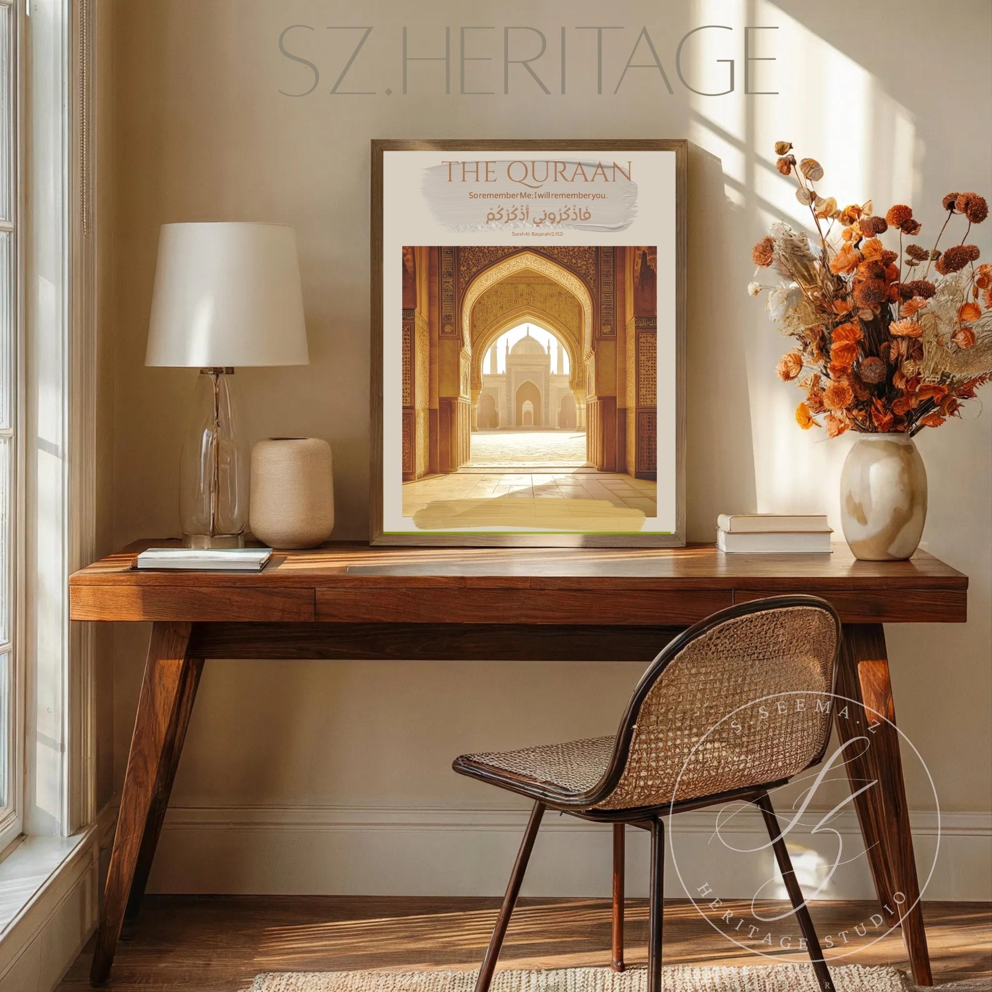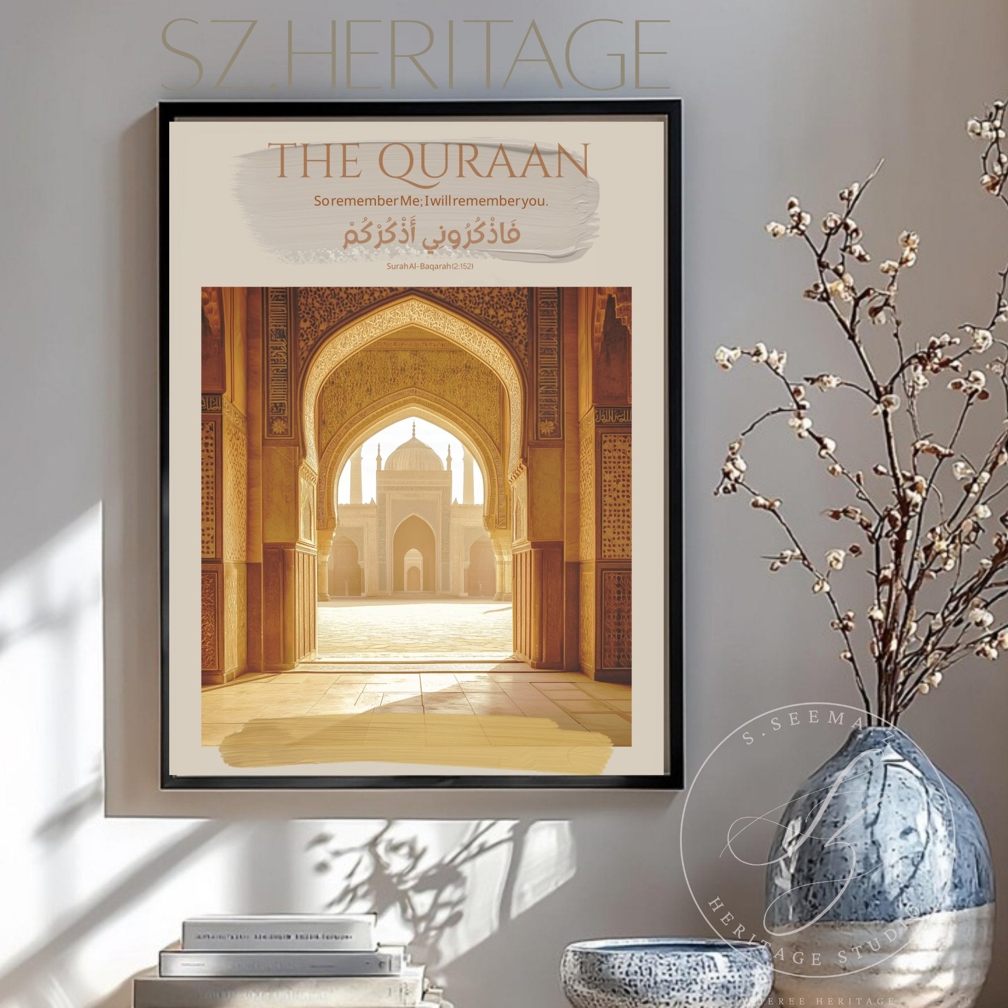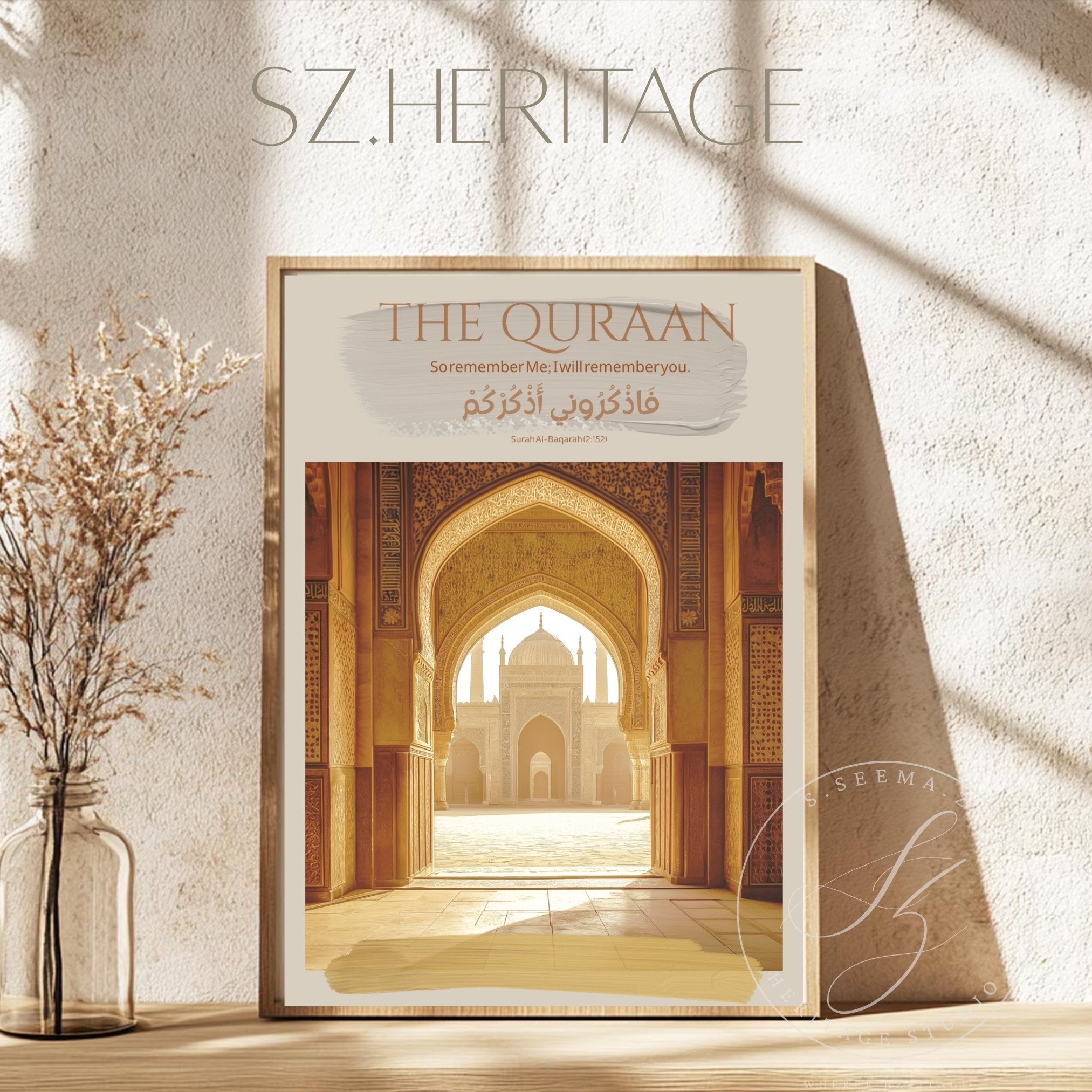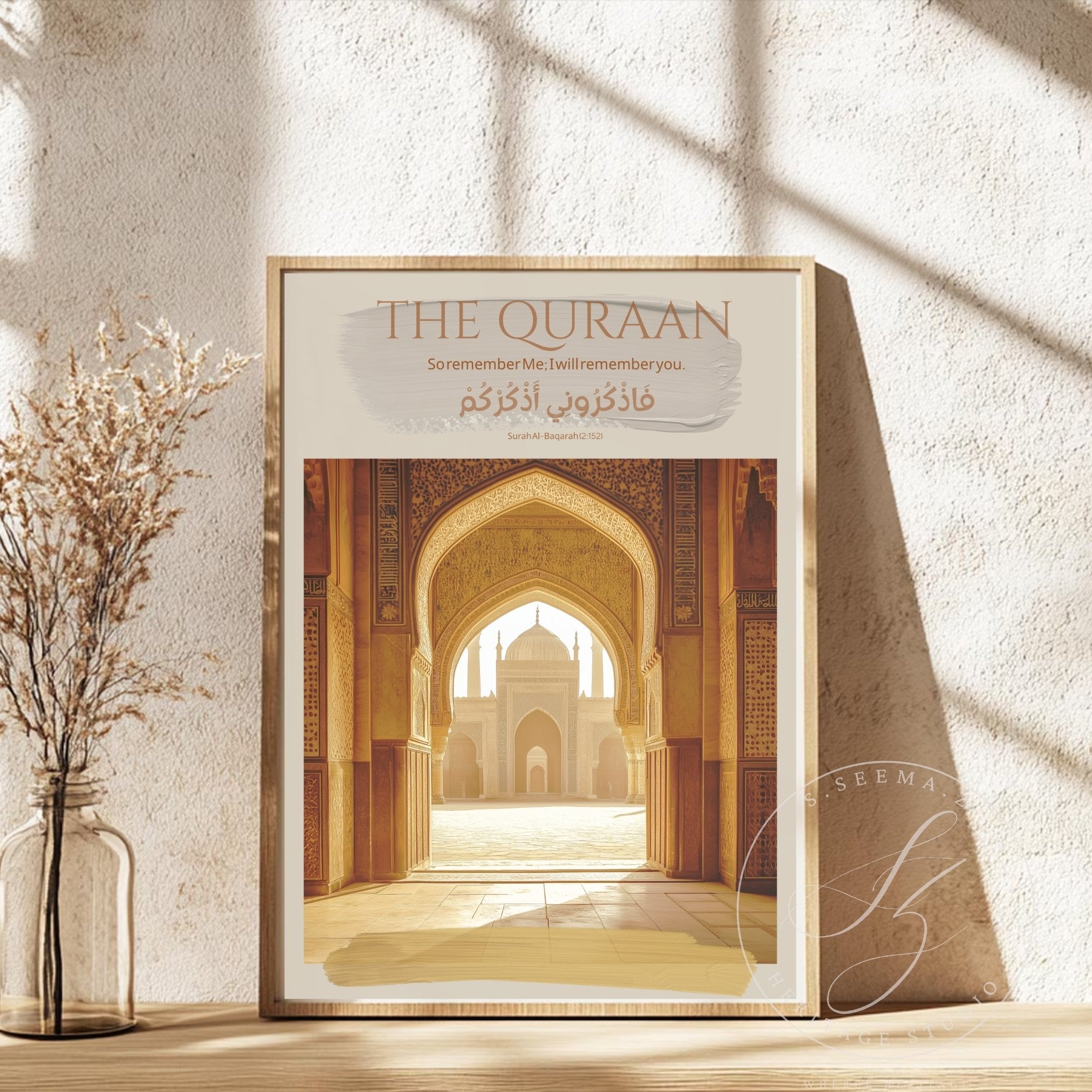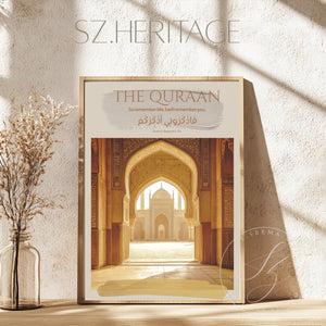 A warm, museum-quality matte poster that brings the hush of a sunlit courtyard indoors. The design centers on a classic Islamic-style archway and central fountain bathed in soft golden light, framed by neutral, sand-toned borders and subtle Arabic script. Printed with archival giclée inks on heavyweight museum-grade paper, the image holds rich, lasting color without glare. This Vertical Matte Poster hangs quietly in living rooms, prayer spaces, or study nooks—where calm reflection and thoughtful decor meet.