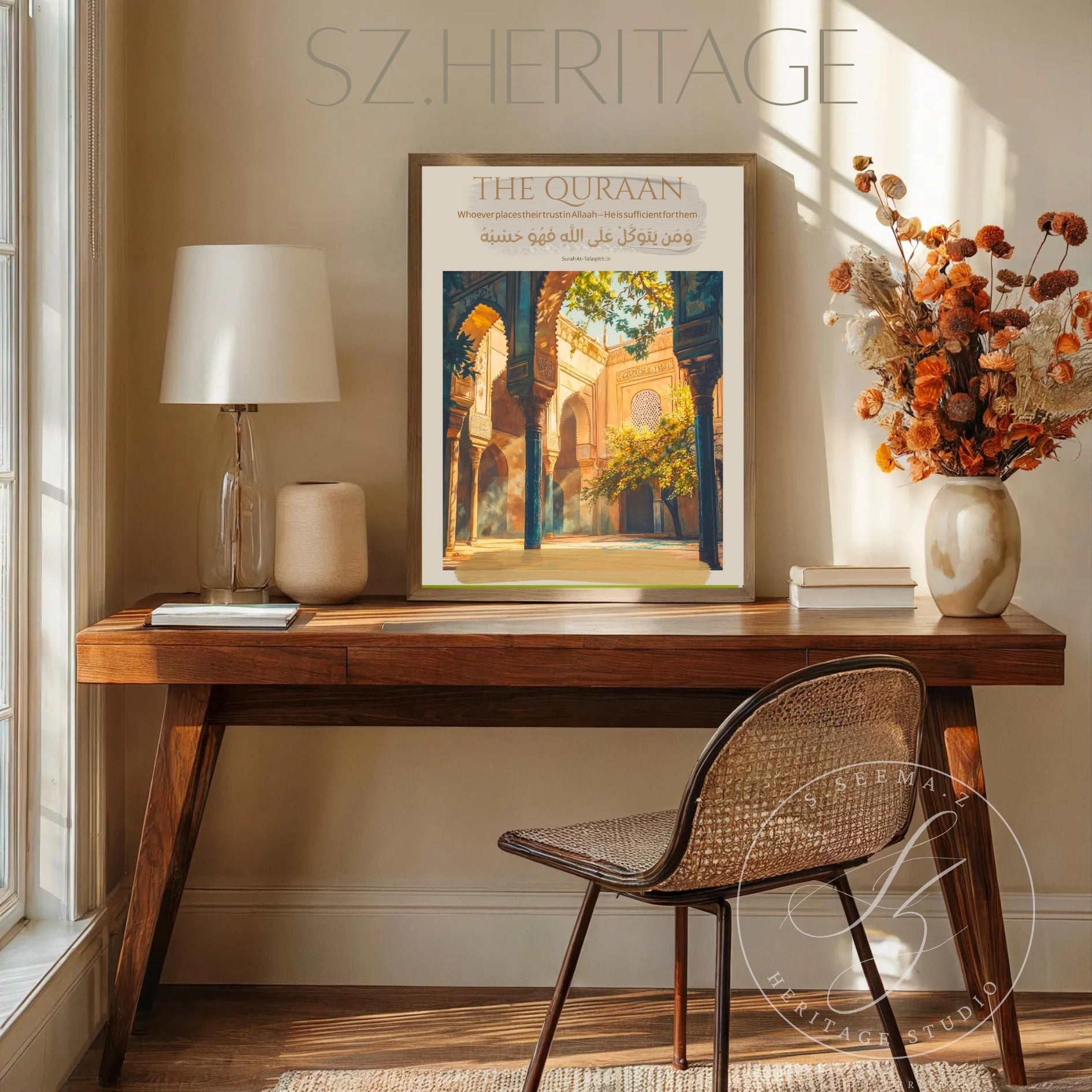 A warm, museum-quality matte poster that brings the hush of a sunlit courtyard indoors. The design centers on a classic Islamic-style archway and central fountain bathed in soft golden light, framed by neutral, sand-toned borders and subtle Arabic script. Printed with archival giclée inks on heavyweight museum-grade paper, the image holds rich, lasting color without glare. This Vertical Matte Poster hangs quietly in living rooms, prayer spaces, or study nooks—where calm reflection and thoughtful decor meet.