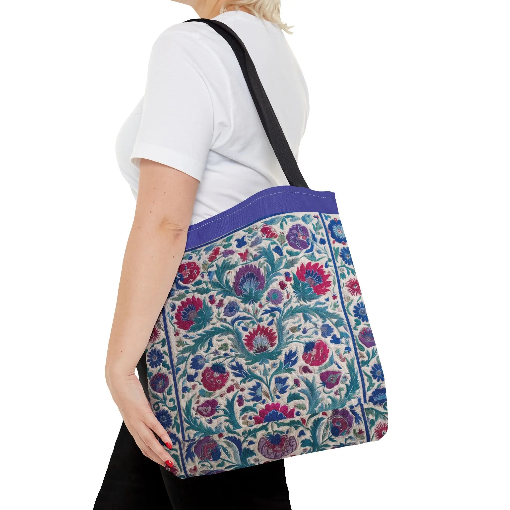 Infuse your daily routine with the elegance of nature and tradition with the Floral Suzani Print Tote Bag. Featuring a breathtaking, symmetrical botanical illustration inspired by classic Persian and Central Asian textiles, this bag showcases a dance of intricate vines, blooming lotuses, and deep magenta petals. Topped with a striking periwinkle purple border, it is a sophisticated fusion of garden-inspired art and modern street style.