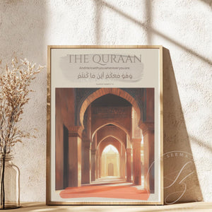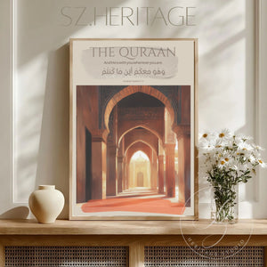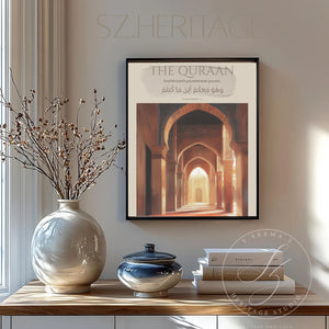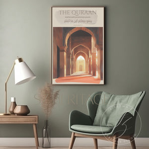 A warm, museum-quality matte poster that brings the hush of a sunlit courtyard indoors. The design centers on a classic Islamic-style archway and central fountain bathed in soft golden light, framed by neutral, sand-toned borders and subtle Arabic script. Printed with archival giclée inks on heavyweight museum-grade paper, the image holds rich, lasting color without glare. This Vertical Matte Poster hangs quietly in living rooms, prayer spaces, or study nooks—where calm reflection and thoughtful decor meet. Product features -